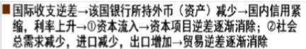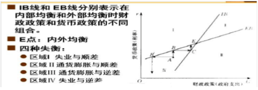 (1)资本完全流动时(扩张的货币政策和财政政策)E点在 BP右下方,内部均衡,外部逆差,调整:外汇收入小于支出;外汇供不应求,外汇升值,本币贬值(但是固定汇率制度下本币不能贬值);政府需要让外汇升值,投放外汇收回本币E点在BP左上方,内部均衡,外部顺差,调整: