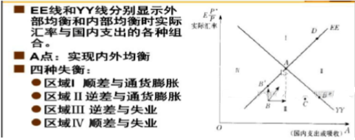 (3)斯旺图形:汇率政策可以实施的前提下,通过支出调整和支出转换政策来实现内外均衡的目标