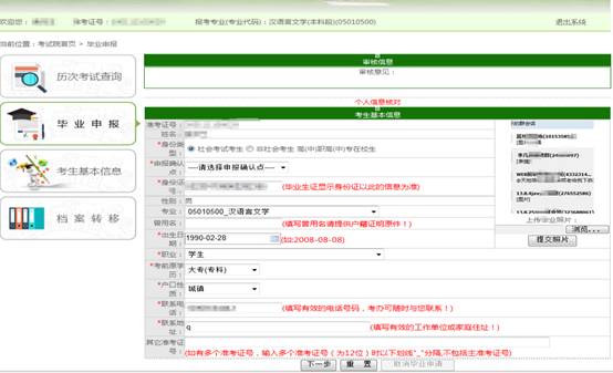 基本信息准确无误后,点击系统底部的“下一步”按钮,如果需要重新填写考生信息,可以点击“重置”按钮。