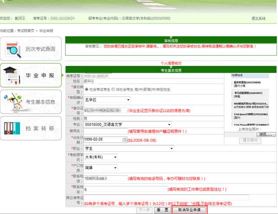 申报确定未确认考生信息前,考生可以取消毕业申请,在考生基本信息界面点击“取消毕业申请”按钮。如图4-1所示: