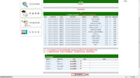 在考生成绩显示界面(如图3-2)上,点击“提交申请资料”按钮,完成毕业申请提交。