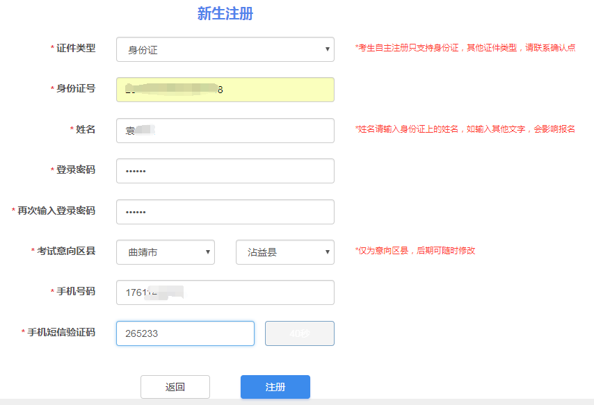 按要求进行输入,即完成注册,注册后,牢记系统生成的准考证号,使用生成的准考证号+密码进行登录