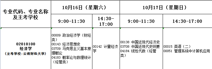 2021年10月云南自考经济学(本科)专业考试课程安排