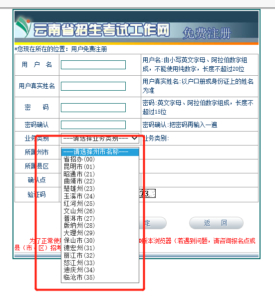 问:云南自考报名注册时无法显示州市及县区怎么解决?