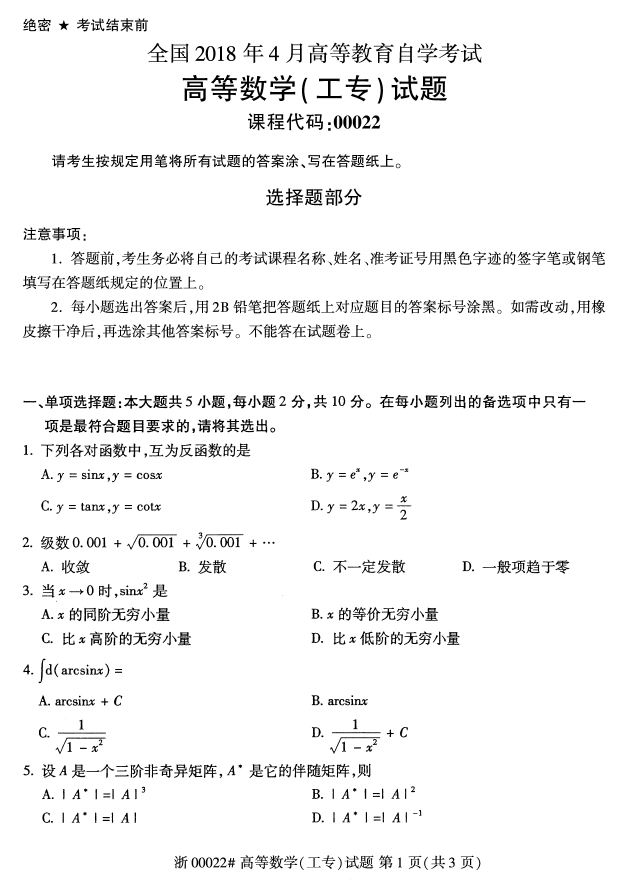 全国2018年4月自考00022高等数学(工专)试卷真题,由云南自考网整理。更多自考试题练习,请自考学生关注云南自考网。