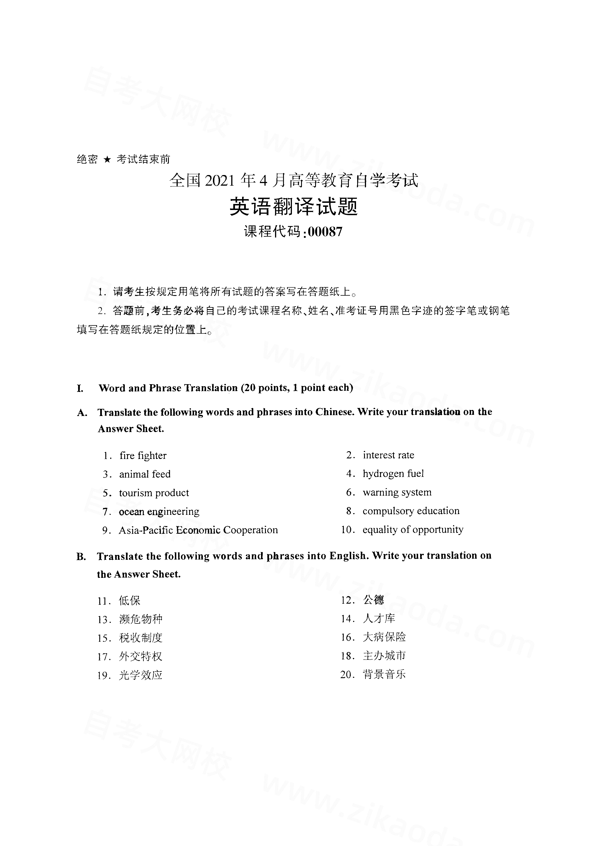 以下是2021年4月云南自考00087英语翻译试题真题试卷内容,如有疑问可咨询;