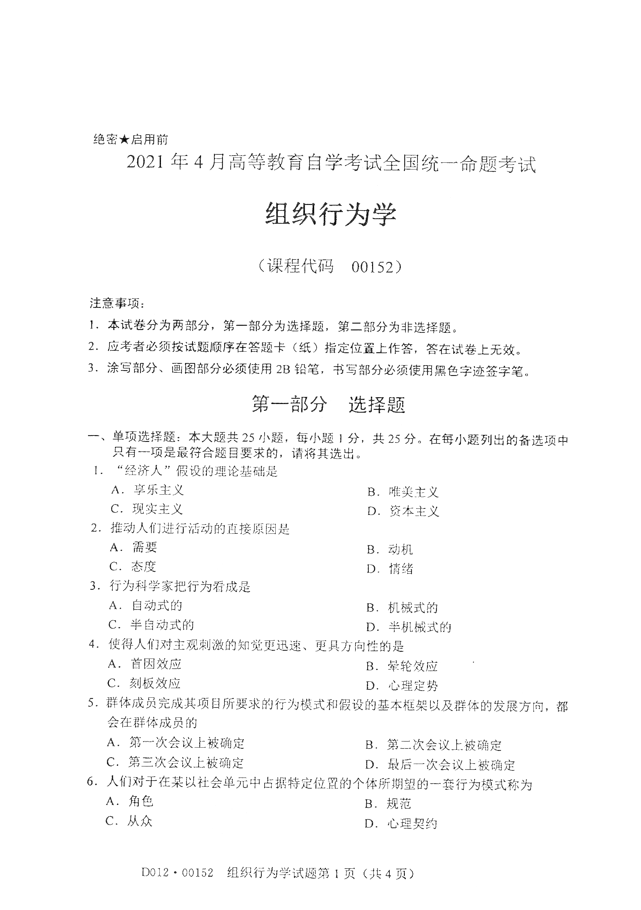 以下是2021年4月云南自考00152组织行为学真题试卷内容,如有疑问可咨询;