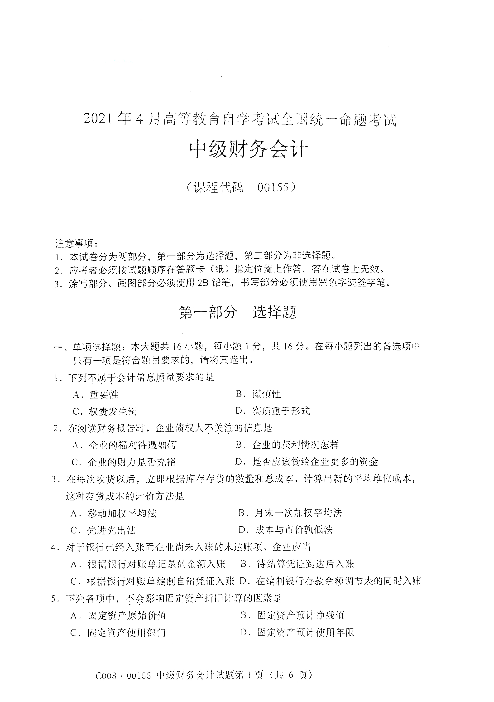 以下是2021年4月云南自考00155中级财务会计真题试卷内容,如有疑问可咨询;