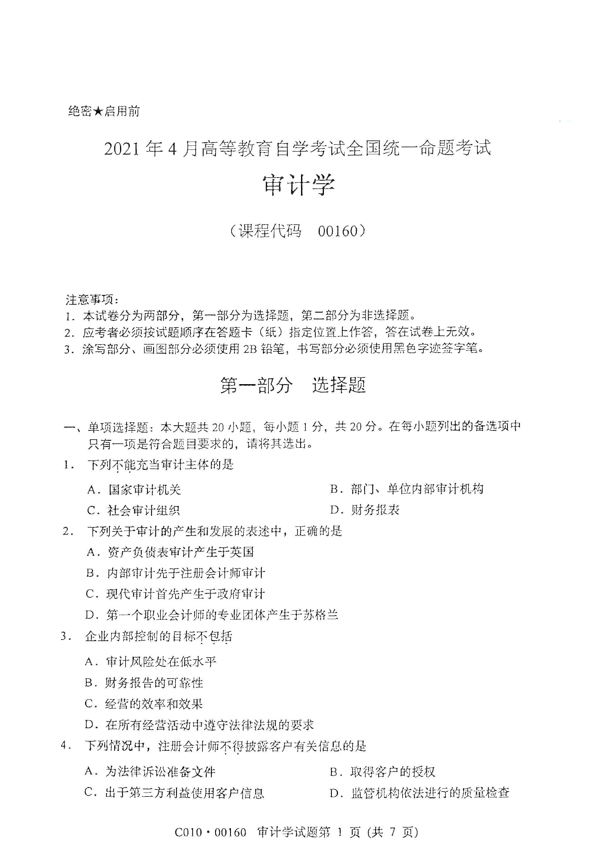 以下是2021年4月云南自考00160审计学真题试卷内容,如有疑问可咨询;