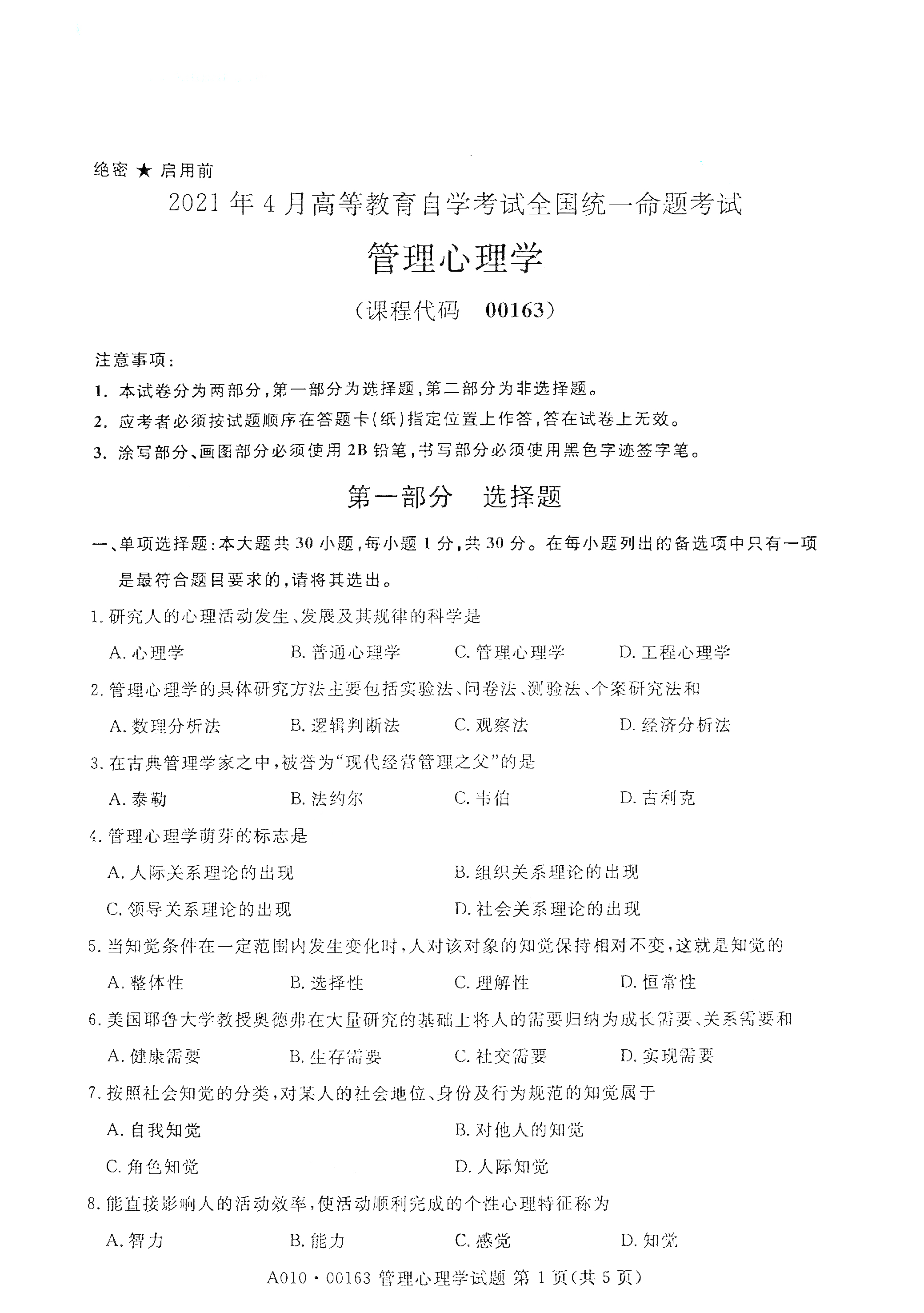 以下是2021年4月云南自考00163管理心理学真题试卷内容,如有疑问可咨询;