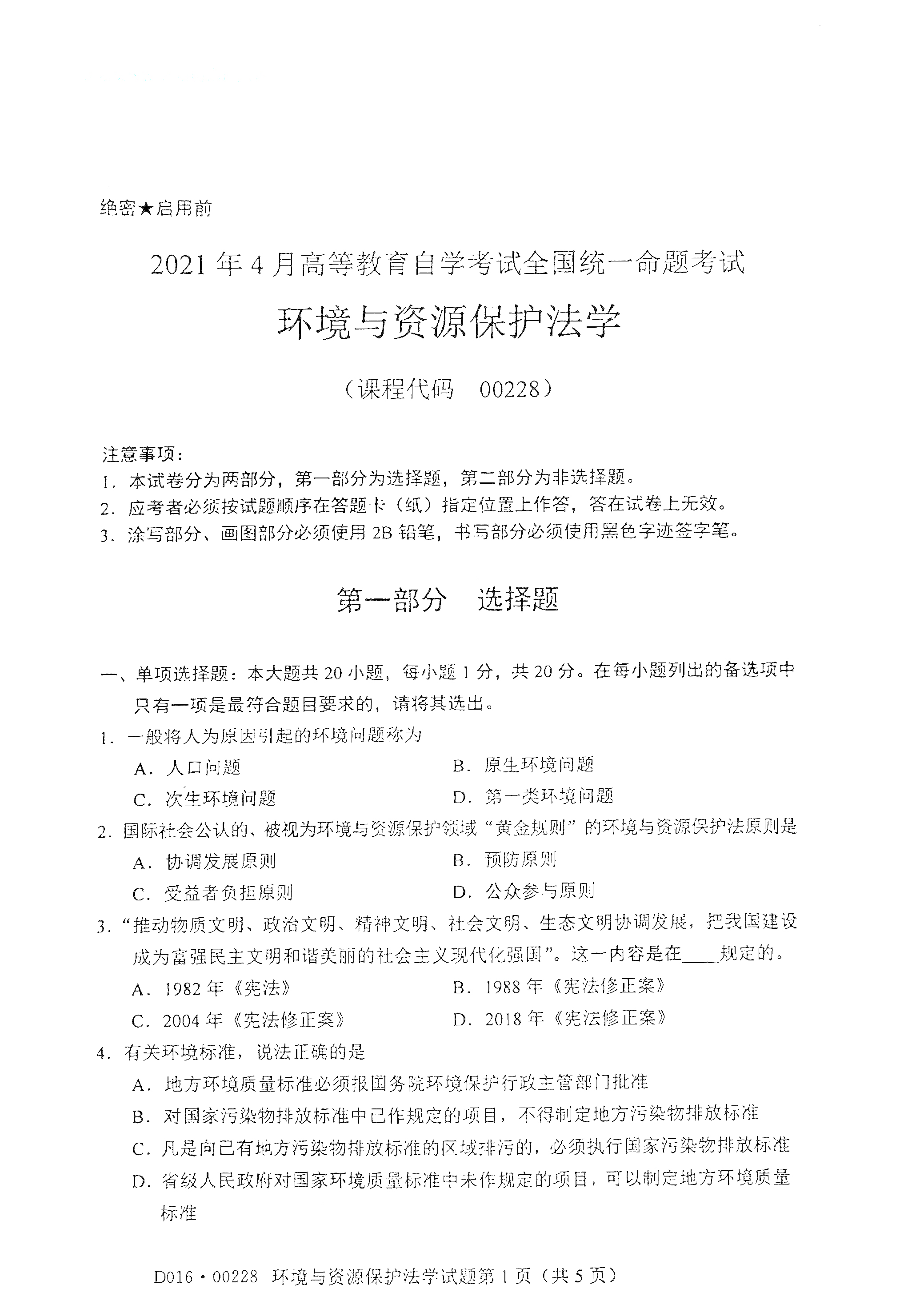 以下是2021年4月云南自考00228环境与资源保护法学真题试卷内容,如有疑问可咨询;