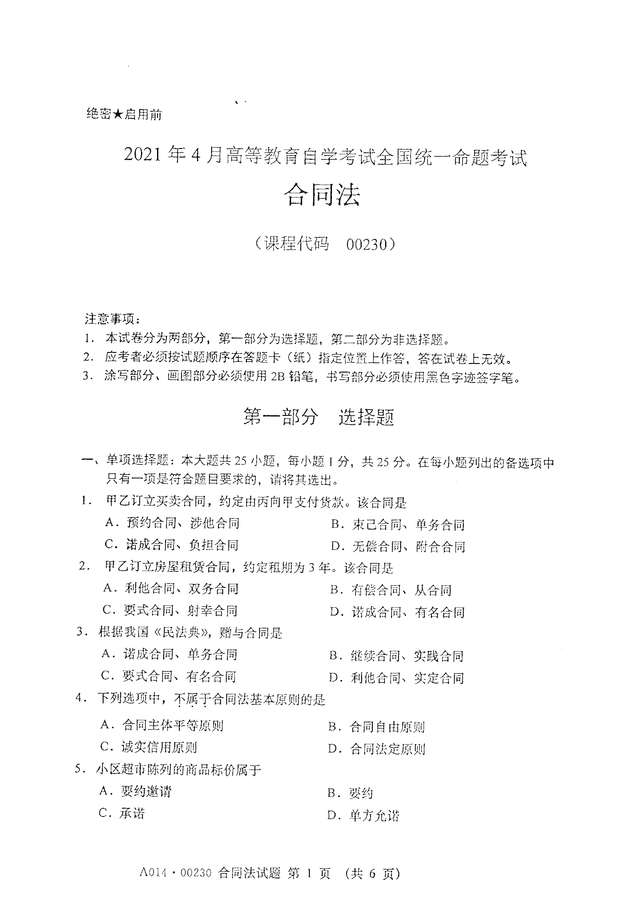 以下是2021年4月云南自考0230合同法真题试卷内容,如有疑问可咨询;