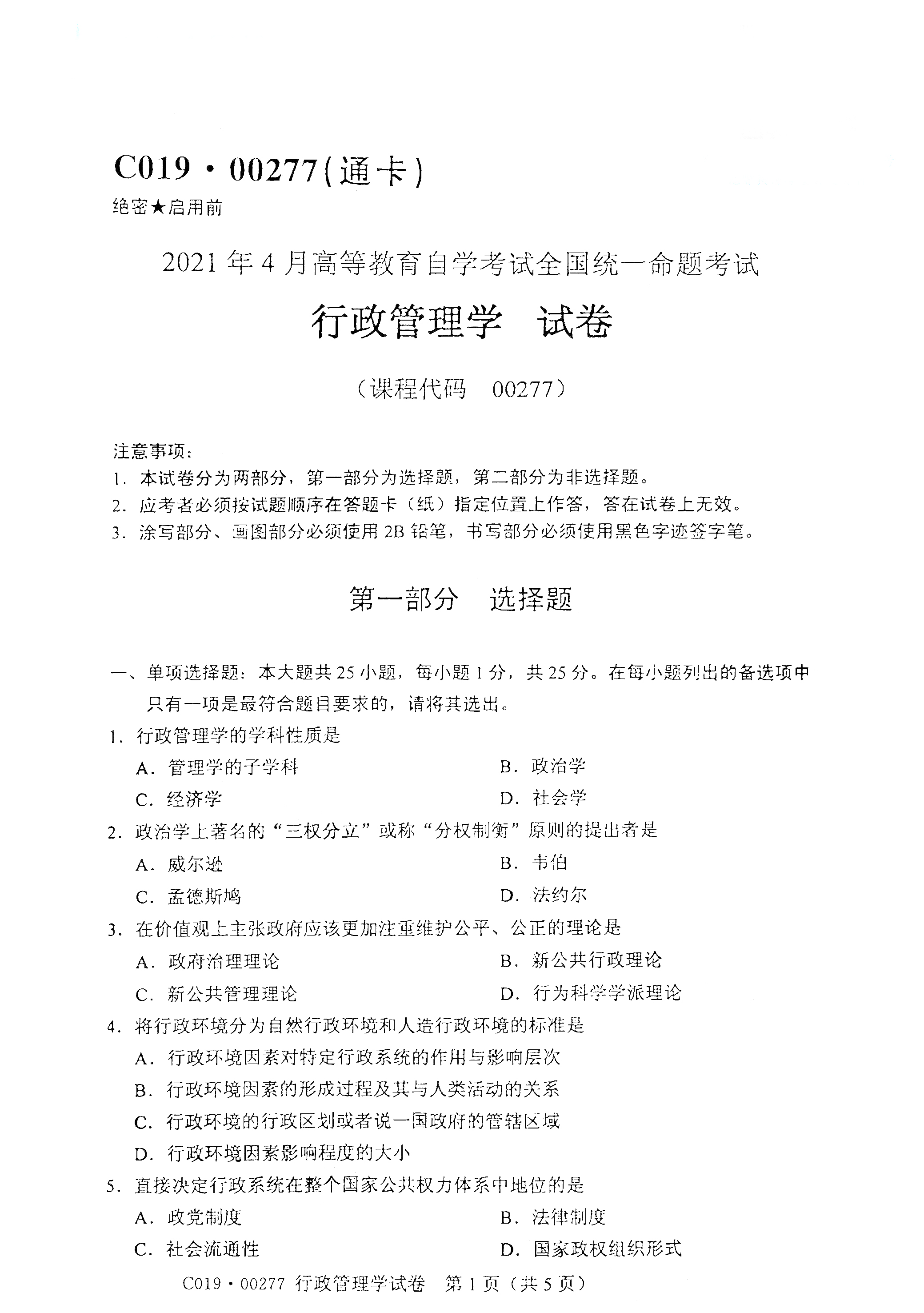 以下是2021年4月云南自考00277行政管理学试卷真题试卷内容,如有疑问可咨询;