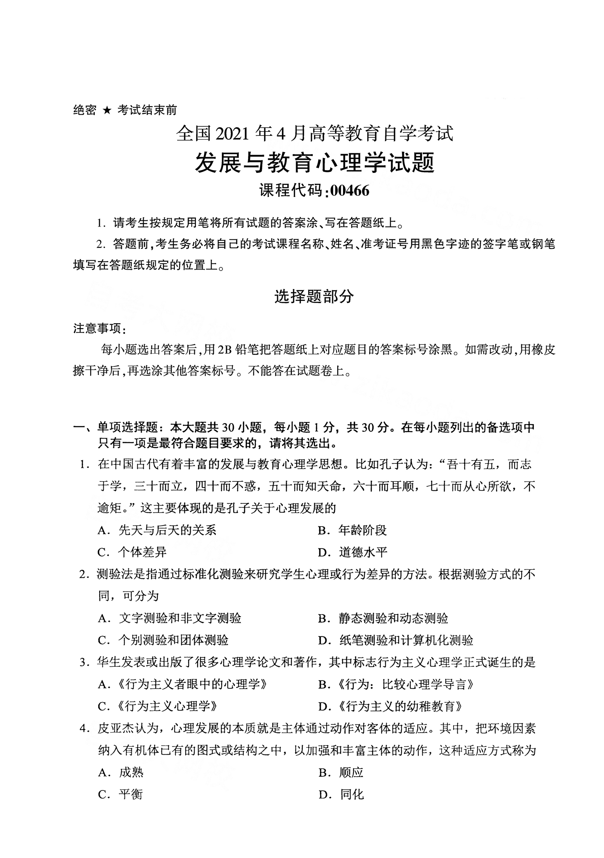 以下是2021年4月云南自考00466发展与教育心理学试题真题试卷内容,如有疑问可咨询;