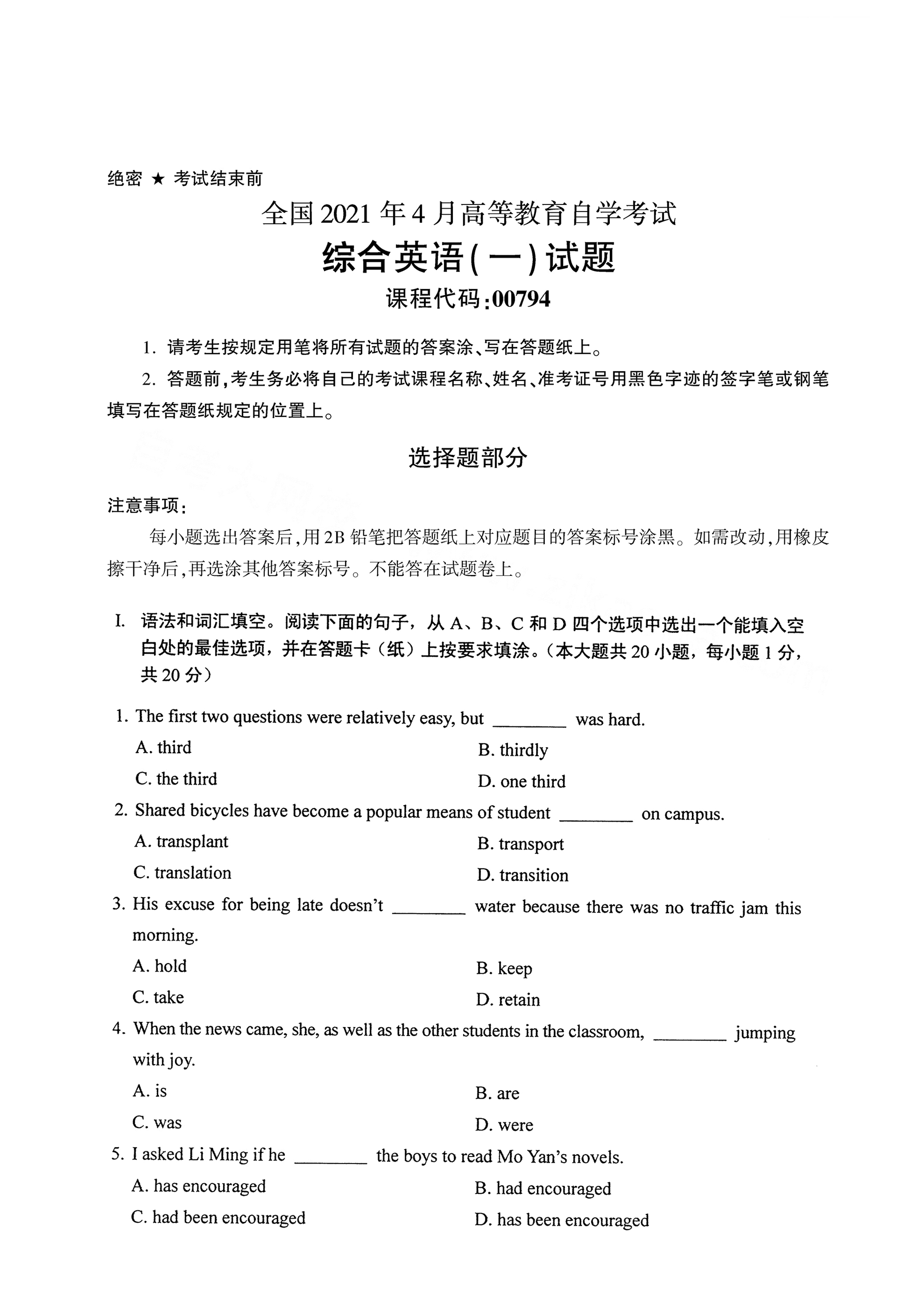 以下是2021年4月云南自考综合英语(一)试题真题试卷内容,如有疑问可咨询;