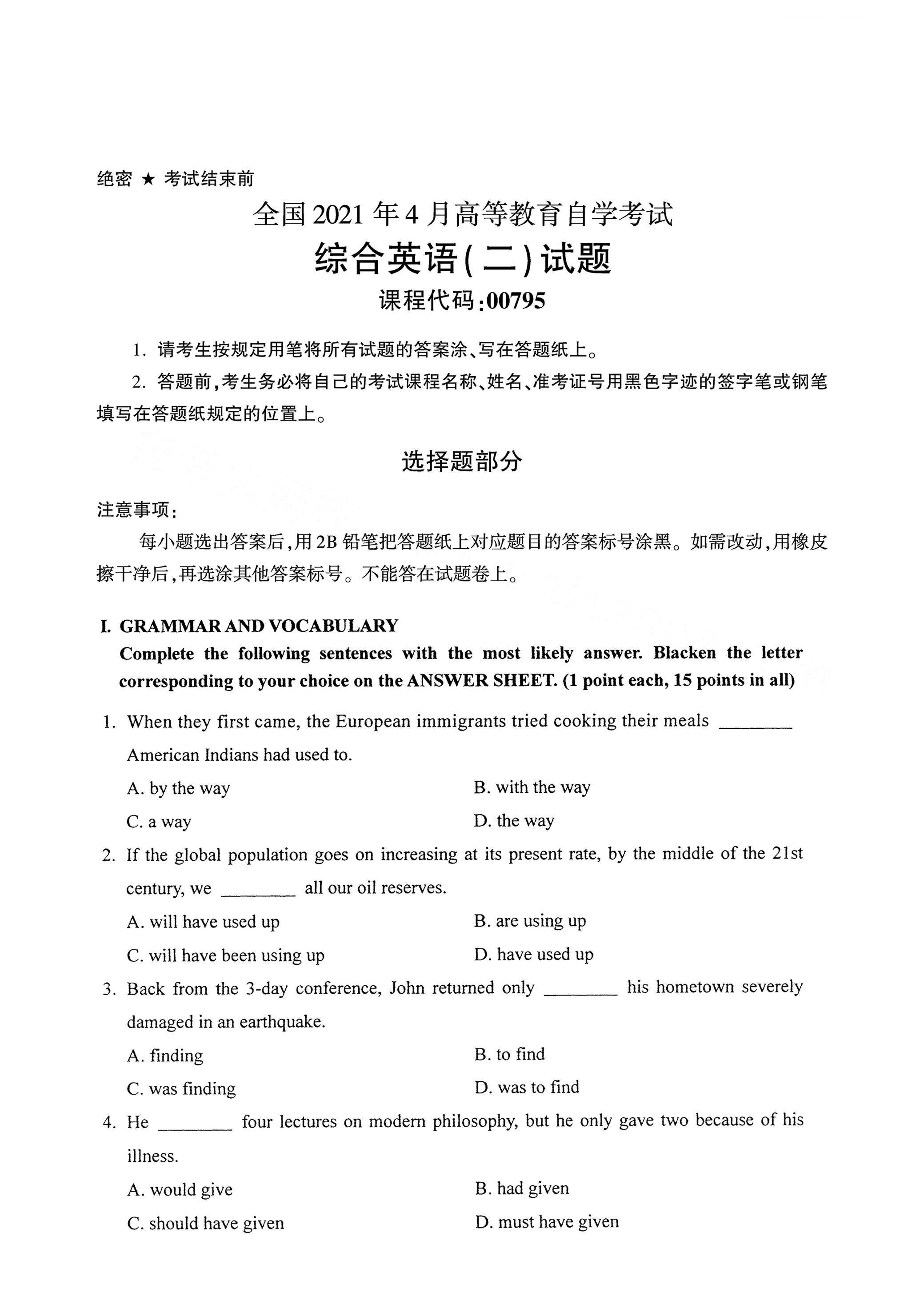以下是2021年4月云南自考综合英语(二)试题真题试卷内容,如有疑问可咨询;