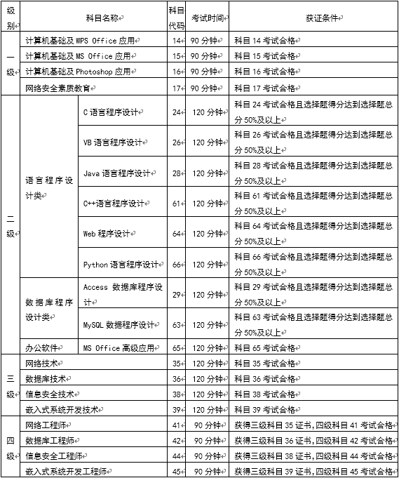 一级:操作技能级。考核计算机基础知识及计算机基本操作能力,包括Office办公软件、图形图像软件、网络安全素质教育。