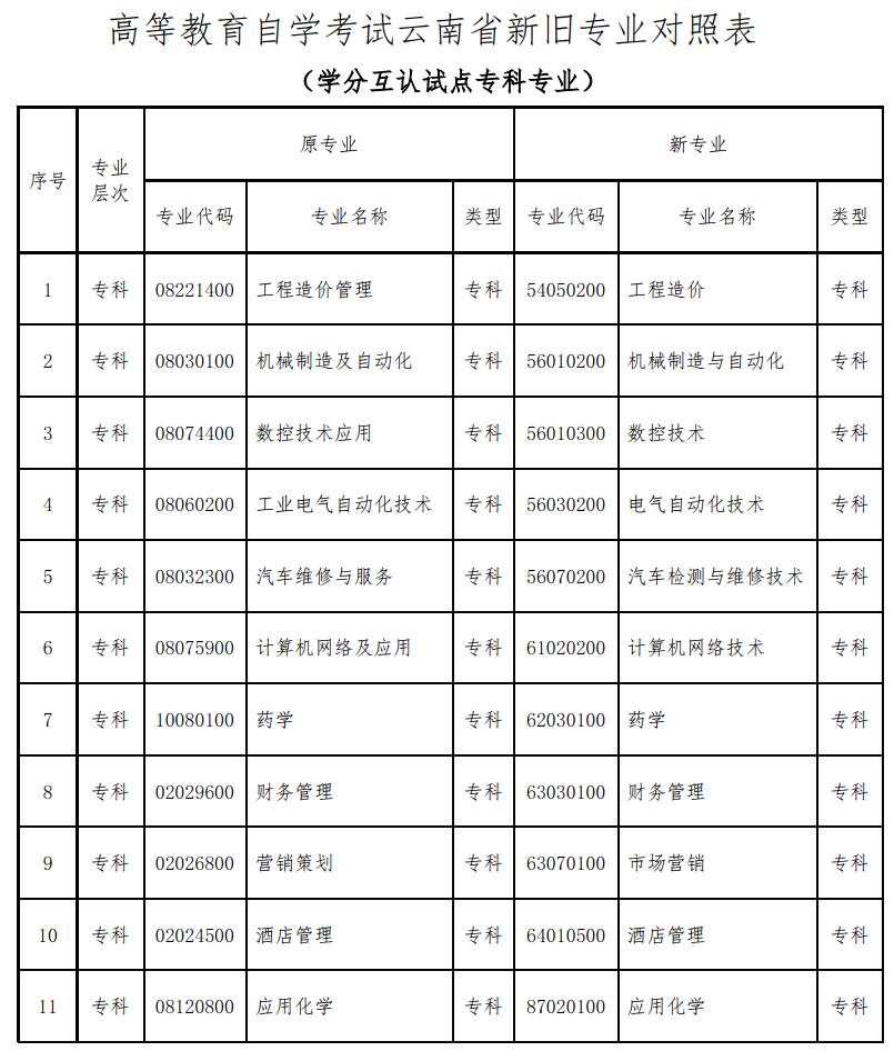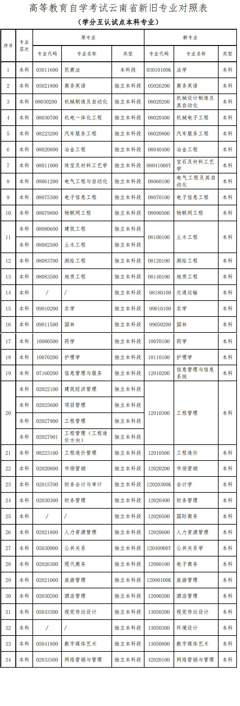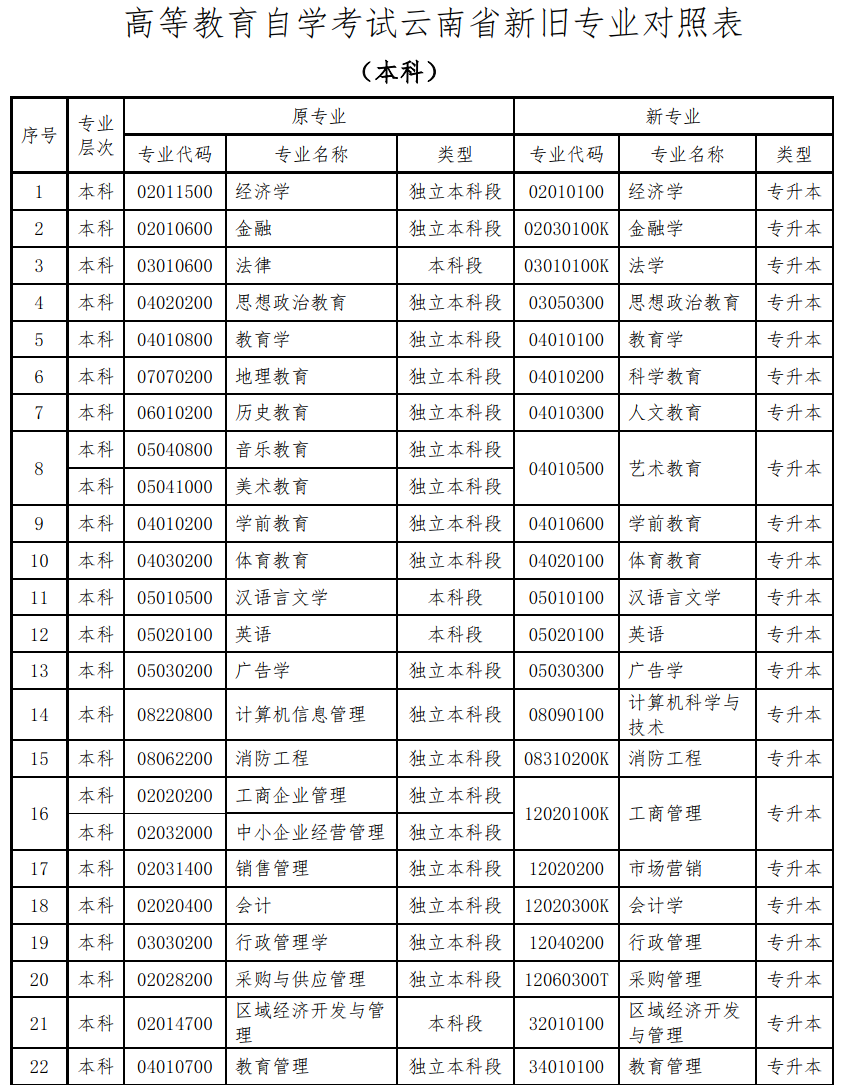 为进一步规范高等教育自学考试专业设置,按照《教育部办公厅关于印发<高等教育自学考试专业设置实施细则>和<高等教育自学考试开考专业清单>的通知》(教职成厅〔2018〕1号)的要求,云南省统招考生考试院按照《云南省高等教育自学考试新旧专业对照表》(见附件)中的对应关系,对“经济学”等86个本专科专业的专业代码和专业名称进行了调整。在此,云南省统招考生考试院公告如下: