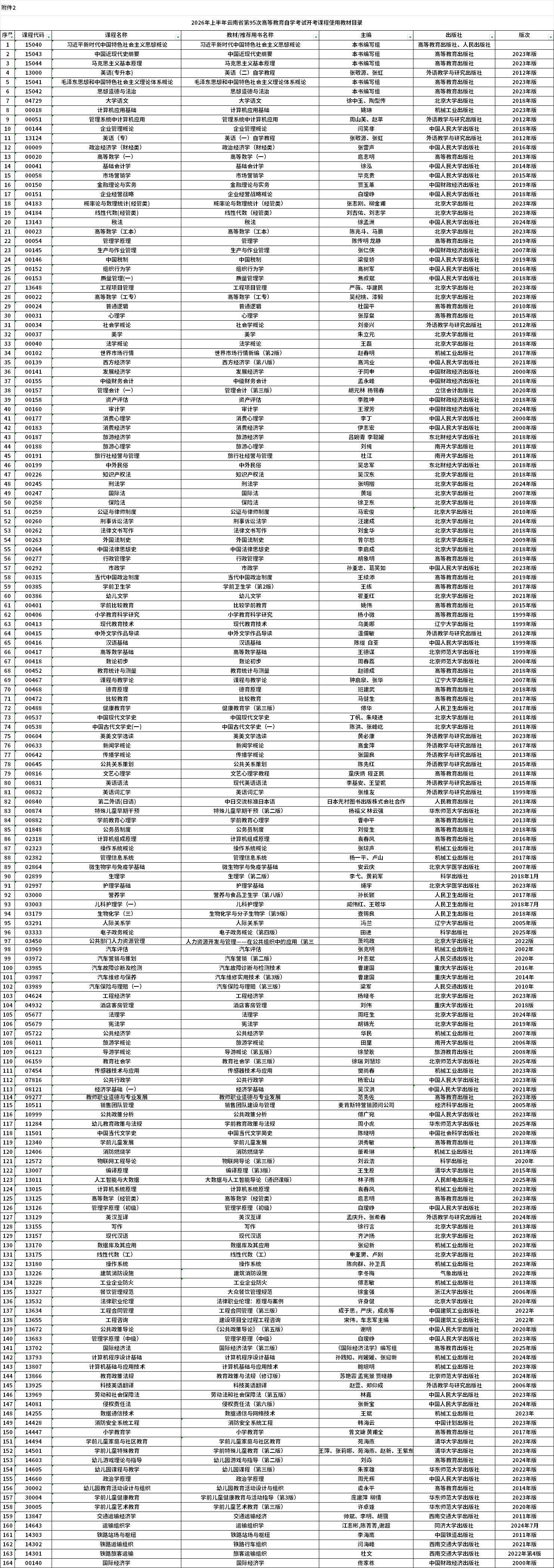 2026年上半年云南自学考试开考课程使用教材目录